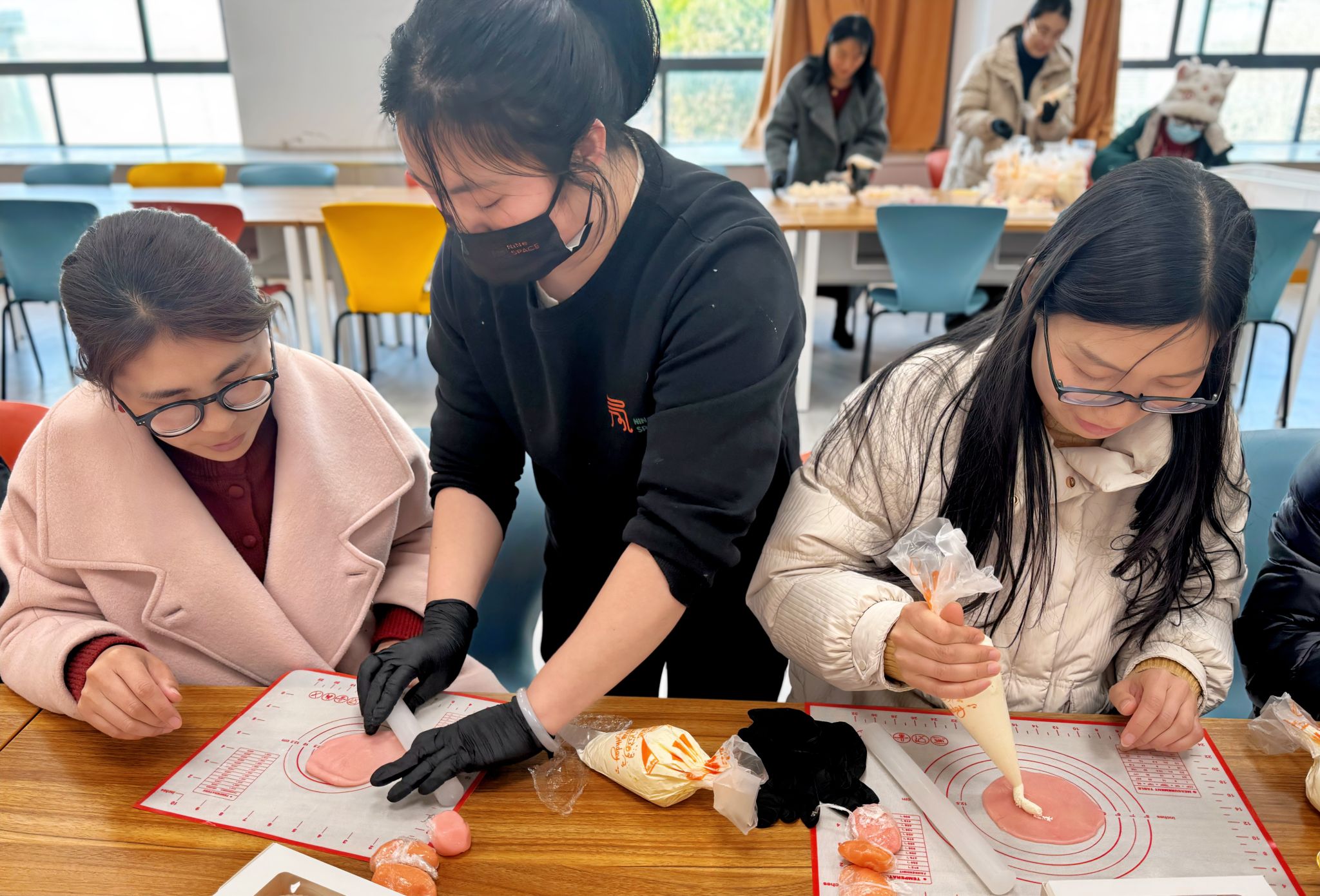 活动现场洋溢着浓厚的节日气息。两院工作人员早早布置了现场、准备好材料,女教职员工们热情高涨,纷纷挽起袖子“一较高下”。在纸杯蛋糕装饰环节,老师们手持奶油裱花袋,小心翼翼地挤出细腻的奶油花,每一道弧线、每一个褶皱都饱含着用心。在雪媚娘的制作过程中,经过烘焙老师的指导,大家可以熟练地制作糯米皮、调制内馅,手法娴熟而利落。大家在欢声笑语中分享彼此在工作中的点滴成就和生活中的美好瞬间。活动还贴心地为大家设置了茶歇区,活动现场充满欢声笑语。
