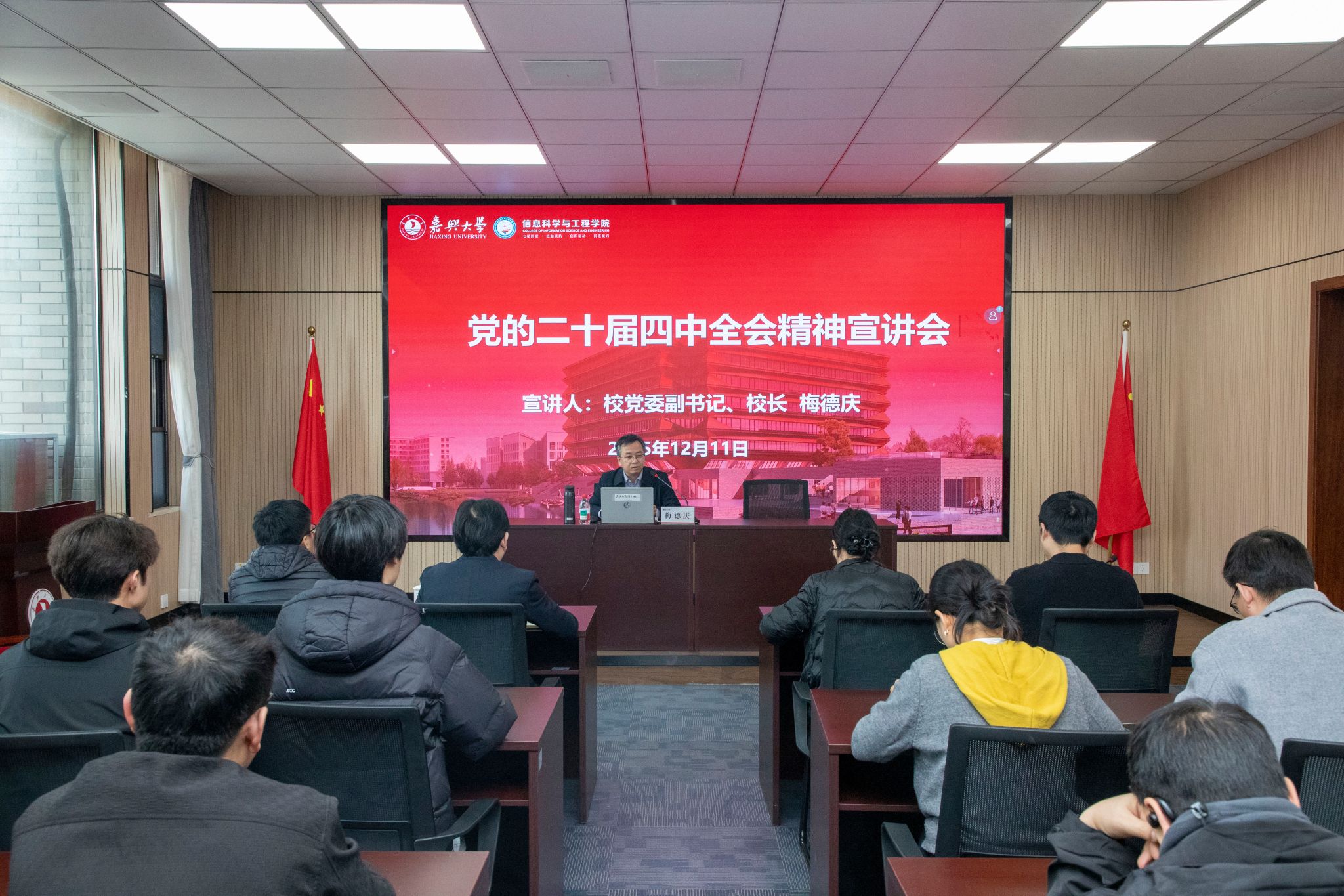 梅校长系统介绍了党的二十届四中全会基本情况,从历史、现实、理论、实践四个维度深入阐释了全会召开的历史方位与时代价值,重点解读了“以中国式现代化全面推进强国建设、民族复兴伟业”这一主题主线,以及“六个坚持”“七大目标”“十二项战略部署”的核心内容。同时,梅校长传达了省委十五届八次全会精神,指出省委全会锚定“十五五”发展总目标,明确了“六个重大突破、六个更加”的战略要求。结合信息学院学科特色与人才培养方向,梅校长着重分析了“创新浙江”建设与打造“人工智能创新发展高地”等重要部署,深刻阐明了学院在服务区域创新发展中的独特机遇与责任使命。