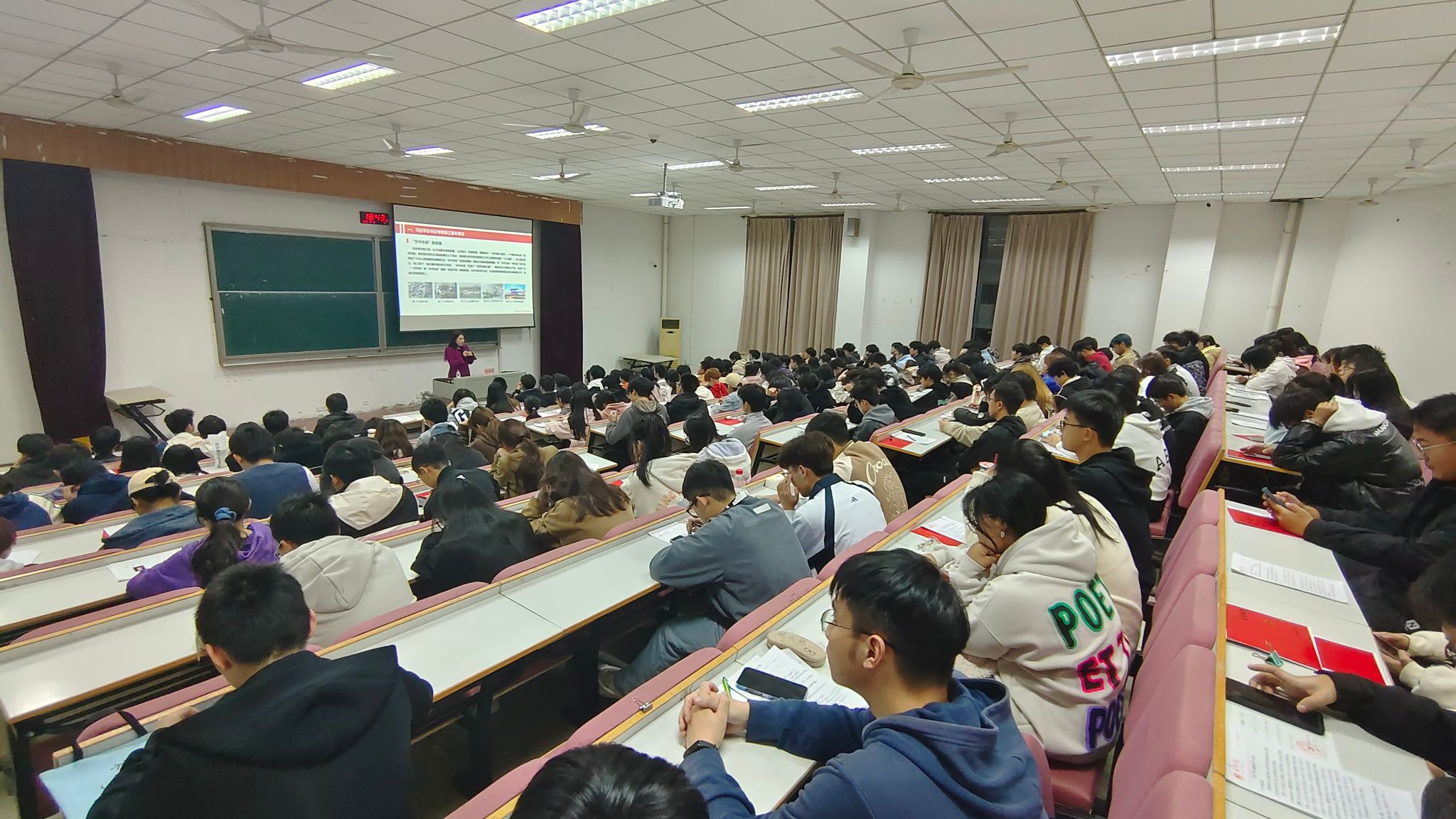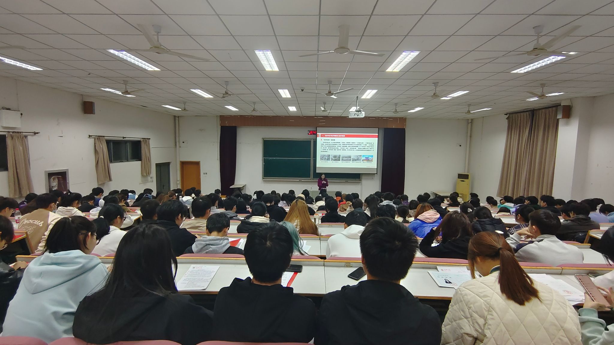 张老师从“一个村”、“一座城”、“一个馆”、“一座园”的故事讲述出发,详细讲解习近平总书记考察浙江基本情况,继而深入解读了习近平总书记对浙江发展提出新要求,即浙江要在以科技创新塑造发展新优势上走在前列;浙江要在推进共同富裕中先行示范;浙江要在深化改革、扩大开放上续写新篇;浙江要在建设中华民族现代文明上积极探索。同时,带领师生们一起学习了省委学习贯彻习近平总书记考察浙江重要讲话精神的相关内容。最后张老师强调当代青年要将个人命运与国家发展相结合,贡献自己的青春力量。