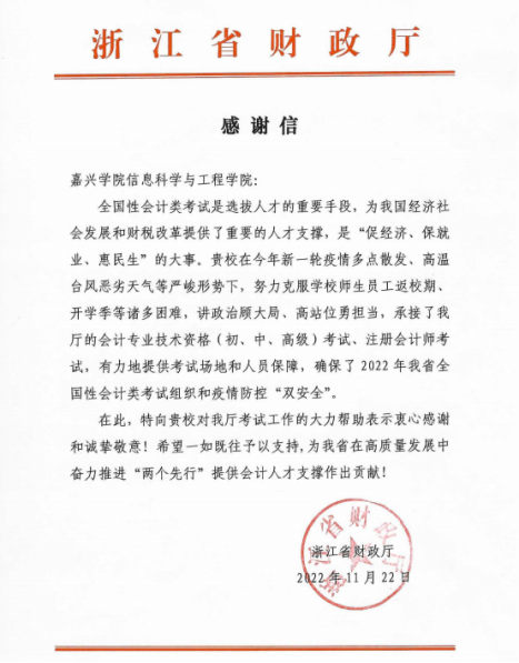 近日,学院收到浙江省财政厅的感谢信,对学院在今年新一轮疫情多点散发、高温台风恶劣天气等严峻形势下,努力克服学校师生员工返校期、开学季等诸多困难,讲政治顾大局、高站位勇担当,承接了省财政厅的会计专业技术资格考试和注册会计师考试,有力地提供考试场地和人员保障,确保了2022年我省的全国会计类资格考试组织和疫情防控“双安全”,特向学院表示感谢!