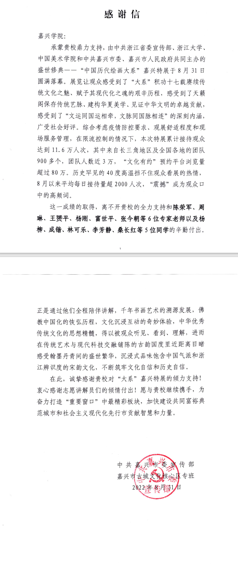 9月1日,我院收到中共浙江省嘉兴市委宣传部感谢信,感谢学院教师张今朝利用暑期对盛世修典——“中国历代绘画大系”嘉兴特展的倾情付出。