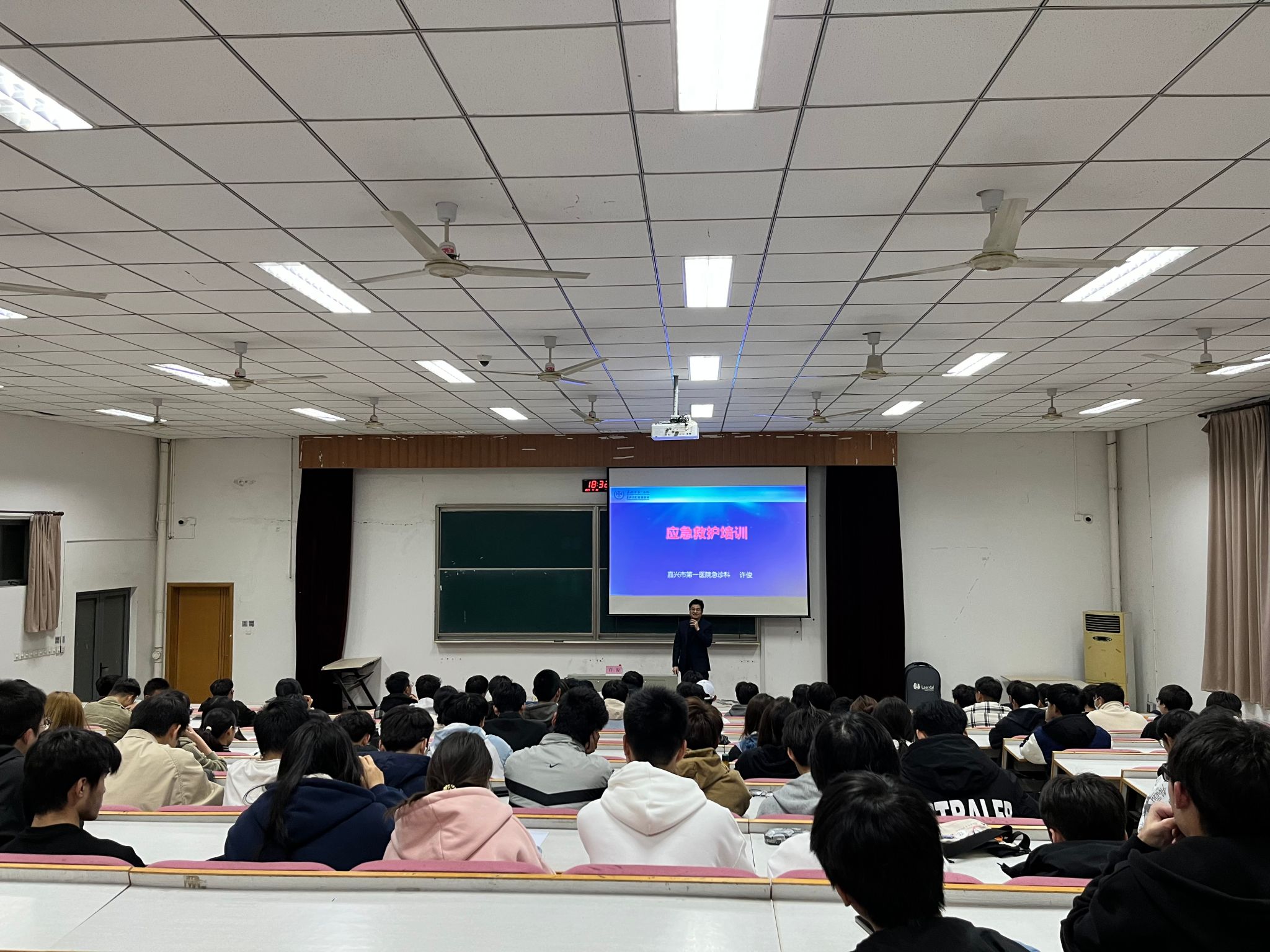首先,由嘉兴市第一医院急诊医学科副主任许俊为全体寝室长普及急救知识。许医生阐述了学习应急知识的必要性和重要性,其次重点讲解了心肺复苏的操作流程、AED使用方式、气道异物梗阻急救处理方法、溺水和重症中暑的急救处理方法。理论讲解完毕后,医护老师现场利用模拟人对心肺复苏各项操作进行了示范演练,寝室长也在专业指导下进行了实操训练。